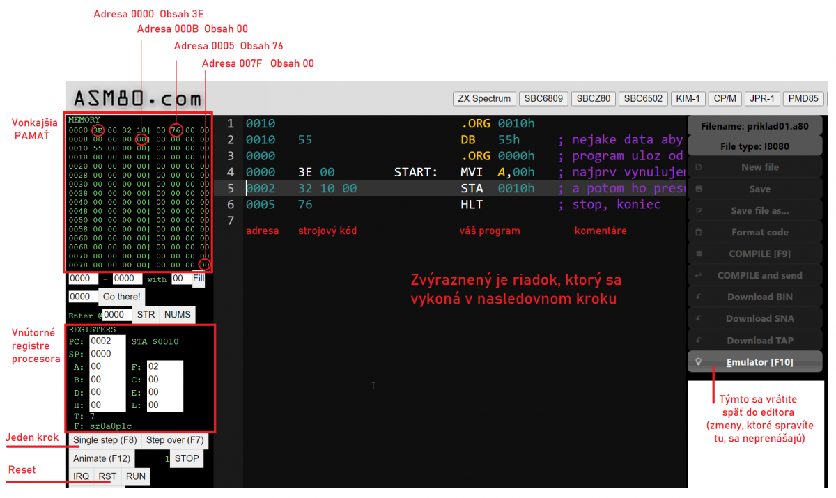 Tieto jednoduché programy budeme analyzovať v simulátore procesora 8080. Pri práci je dobrou pomôckou tento ťahák s výberom inštrukcií. Obsluhu simulátora sme vysvetlili na cvičeniach, preto tu nájdete len tento stručný obrázok s opisom.