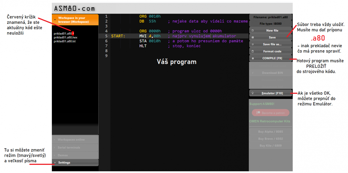 Programy, ktoré vidíte na tejto stránke sa nedajú jednoducho skopírovať do simulátora cez Copy/Paste, pretože si myslíme, že naučiť sa to dá len tak, že si tie programy sami napíšete krok za krokom aby ste vedeli čo ktorá inštrukcia robí.